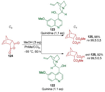 Dessimetrização de compostos meso A dessimetrização de anidridos cíclicos é uma estratégia importante para a formação enantiosseletiva de monoésteres de ácidos dicarboxílicos que pode ser levada a cabo, de forma diastereosseletiva, mediante o uso de nucleófilos quirais como álcoois e aminas (ver Esquema 14). Em 2000, Bolm e colaboradores utilizaram os alcaloides quinina (122) e quinidina (123) em uma reação de alcoólise enantiodivergente (re 99,5:0,5) do aduto endo 124 obtido da reação de Diels-Alder entre ciclopentadieno e anidrido maleico (Esquema 29).130 O reagente quiral pôde ser recuperado ao final deste processo.