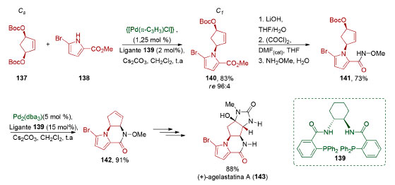 O grupo carboxílico do monoéster metílico enantiopuro obtido por dessimetrização do anidrido 129 foi convertido no éster redox-ativo 131 (67%). Dois acoplamentos descarboxilativos mediados por níquel (85% e 66% de rendimento) viabilizaram a incorporação estereosseletiva dos dois substituintes arila. Desproteção, seguida por uma aminação redutiva (83%), permitiu obter o intermediário 136 em oito etapas e 31% de rendimento global, completando uma síntese formal enantiosseletiva da (+)-asenapina (128).133 Em 2006, Trost e colaboradores134 utilizaram uma reação de substituição alílica enantiosseletiva, via catálise de paládio, na dessimetrização do carbonato duplo do meso-1,3-ciclopentenodiol (137, Esquema 32). O éster pirrólico 138 foi utilizado como nucleófilo e o produto 140 foi obtido em excelente enantiosseletividade (83%, re 96:4). O éster 140 foi convertido em um derivado de ácido hidroxâmico 141 (73%) de forma a viabilizar uma etapa de substituição alílica intramolecular (91%). O produto tricíclico 142 obtido foi então convertido em quatro etapas na (+)-agelastatina A (143).
