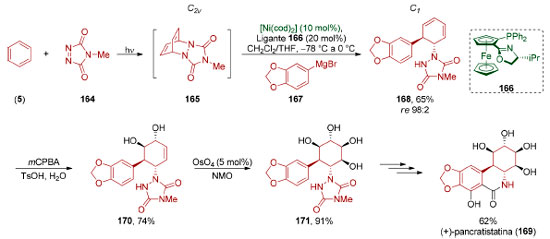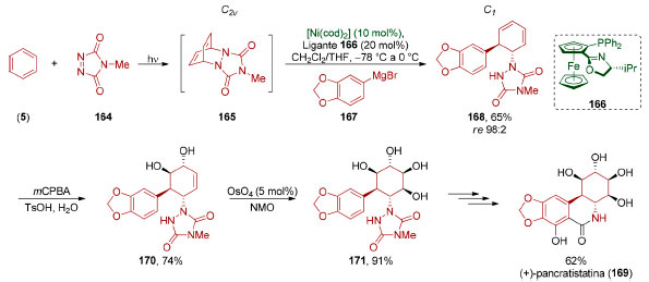 A dessimetrização enantiosseletiva de compostos aromáticos também pode ser realizada por métodos não-enzimáticos. Em 2017, Sarlah e colaboradores desenvolveram uma dessimetrização do cicloaduto meso 165,138 formado in situ através de uma cicloadição [4+2] fotoquímica entre benzeno (5) e 4-Metil-1,2,4-TriAzolin-3,5-Diona (MTAD, 164, Esquema 36).139 Na presença do ligante 166, foi realizada uma reação de substituição alílica via catálise de níquel utilizando um reagente organomagnésio 167 como nucleófílo (65%, re 98:2). O processo como um todo consiste em uma trans-carboaminação enantiosseletiva.140