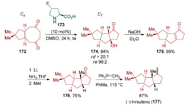 ![]() Esquema 37. Dessimetrização aplicada à síntese do (−)-hirsuteno (177), por List e colaboradores142