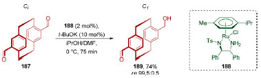 Em 2018, Benedetti, Micouin e colaboradores demonstraram uma dessimetrização de um dialdeído centrossimétrico 187 através de uma transferência de hidrogênio assimétrica utilizando o catalisador de Noyori 188 (Esquema 40).147 As duas unidades formilas estão em posição pseudo-para no [2.2]-paraciclofano 187. Ao realizar uma redução em somente um dos grupos formilas do substrato 187, obteve-se o hidroxi-aldeído 189 de quiralidade planar em excelente enantiosseletividade (74%, re 99,05:0,5).