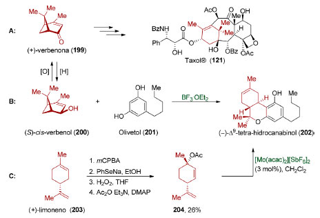 Várias sínteses totais foram realizadas utilizando monoterpenos quirais como material de partida.157 Este tipo de reconhecimento de padrão ainda é amplamente utilizado, principalmente para a síntese total de terpenoides.158 Apesar do advento de metodologias baseadas em catálise enantiosseletiva,159 muitas sínteses que partem de um substrato quiral ainda são vantajosas uma vez que ambos os enantiômeros de muitos monoterpenos podem ser obtidos de forma enantiopura a um custo relativamente baixo. Em 1997, Wender e colaboradores realizaram uma síntese total do Taxol® (121, Esquema 43A).160 Nesta síntese, a (+)-verbenona (199) foi utilizada como material de partida para construção de um anel de seis membros contendo um substituinte gem-dimetila presente no produto natural 121. Em 1967, o (S)-cis-verbenol (200) foi utilizado pelo grupo de Mechoulam161 na síntese total do (−)-Δ9-tetra-hidrocanabinol (202, Esquema 43B),162 o princípio psicoativo presente em C. sativa. Trata-se de um processo em cascata, promovido por ácido de Lewis, que ocorre através de uma reação de Friedel-Crafts, seguida de um rearranjo de carbocátion e interceptação intramolecular por uma hidroxila fenólica. Em 2001, Malkov e Kocovsky, demonstraram a aplicação do (+)-limoneno (202) na síntese do (-)-Δ9-tetra-hidrocanabinol (202, Esquema 43C).163