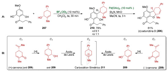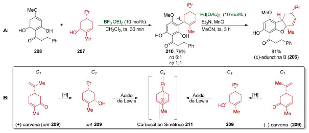 A síntese total da (±)-adunctina B (206), por Dethe e colaboradores (Esquema 46),168 exemplifica de forma representativa como a simetria molecular permite antecipar limitações no uso de reconhecimento de padrões. Ambos os enantiômeros da carvona (207) foram utilizados em várias sínteses totais.169 Partindo-se de 207, um derivado enantiopuro da (−)-carvona (209), o grupo de Dethe realizou a síntese da (±)-adunctina B (206) em duas etapas: uma substituição eletrofílica aromática (79%, rd 6:1, re 1:1), mediada por ácido de Lewis, seguida de uma ciclização oxidativa do tipo Wacker, catalisada por paládio (Esquema 45A). Apesar de ser uma síntese extremamente concisa, o carbocátion alílico 211 formado na presença do ácido de Lewis apresenta um plano de simetria (Esquema 45B) de modo que a quiralidade presente no material de partida é perdida no processo, dando origem a um produto racêmico.