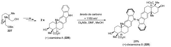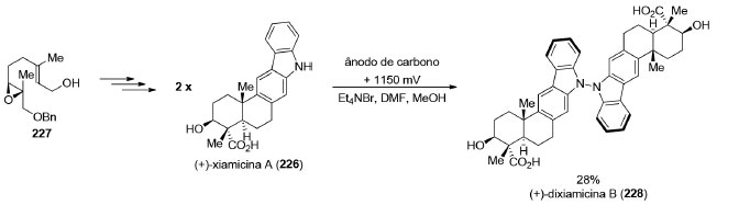 Enquanto os compostos com simetria C2 são quirais, os produtos naturais que pertencem aos grupos pontuais Cs e C2v são aquirais e estão fora do escopo deste artigo. A existência de um eixo de simetria C2 em produtos naturais abre a possibilidade de aumentar a convergência da estratégia sintética ao permitir a preparação simultânea de duas partes iguais da molécula-alvo.180 Uma série de reações como, por exemplo, esterificações, acoplamentos cruzados, alquilações, metátese cruzada de olefinas e cicloadições podem ser empregadas para conectar os dois fragmentos. Uma maneira de se preparar produtos naturais diméricos é a reação de formação de ligação σN−N através de uma oxidação eletroquímica desenvolvida por Baran e colaboradores.181 Nesse trabalho, os autores prepararam o produto natural (+)-xiamicina A (226), em 9 etapas, a partir do álcool 227. A oxidação anódica de 226 levou à formação do alcaloide indólico (+)-dixiamicina B (228), em 28% de rendimento (Esquema 48).