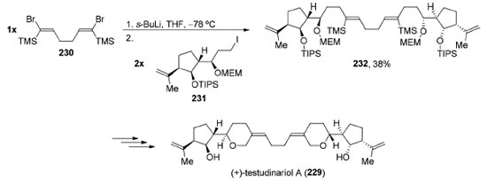 O (+)-testudinariol A (238) é um triterpeno de origem marinha que possui em sua estrutura dimérica um anel ciclopentânico densamente funcionalizado ligado a um 3-tetraidropirano alquilidênico. Cada uma das partes possui quatro centros estereogênicos contíguos. Em 2002, Amarasinghe e Montgomery completaram a síntese total do testudinariol A (229) a partir de uma reação de alquilação bidirecional envolvendo o diânion do composto 230 de simetria C2v. Uma reação de troca de halogênio-metal em 230 permitiu uma reação de dupla alquilação utilizando dois equivalentes do iodeto 231, levando à formação do composto 232 (38%) de simetria C2 (Esquema 49).182 Após algumas transformações bidirecionais, o (+)-testudinariol A (229) foi obtido.