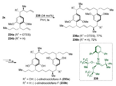 Os cilindrociclofanos são [7,7]-paraciclofanos de 22 membros que possuem atividade citotóxica.183 Alguns deles como, por exemplo, os (−)-cilindrociclofanos A e F (233a e 233b) possuem simetria C2. Em 2000, Smith e colaboradores reportaram a síntese total dos (−)-cilindrociclofanos A e F (233a e 233b) através de uma reação de metátese cruzada de olefinas, seguida por uma reação de metátese de fechamento de anel one-pot (Esquema 50).184 A exposição de dois equivalentes das bisolefinas 234a ou 234b ao catalisador de molibdênio 235 levou à formação dos compostos 236a ou 236b em 77% e 72% de rendimento, respectivamente. Excelentes níveis de seletividade foram observados em favor do produto de acoplamento cabeça-cauda que apresenta simetria C2.