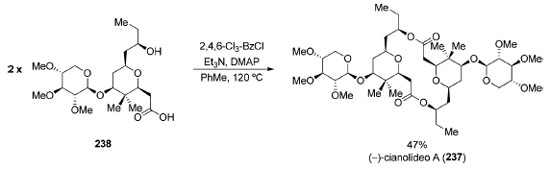 O (−)-cianolídeo A (237) é um macrodiolídeo glicosídico de 16 membros contendo 16 centros estereogênicos e que apresenta potente atividade moluscicida. Em 2013, Waldeck e Krische completaram a síntese total deste produto natural utilizando as condições reacionais de Yamaguchi185 para a síntese do macrodiolídeo de simetria C2 (Esquema 51).186