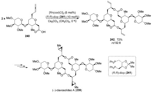 O (−)-clavosolídeo A (239), um macrodiolídeo semelhante ao (−)-cianolídeo A (238), possui 18 centros estereogênicos e estrutura dimérica com simetria C2. Em 2015, Haydl e Breit completaram a síntese total dessa molécula utilizando como etapa chave uma reação de "dimerização"187 do composto 240. Ela se deu a partir de uma reação de adição de ácido carboxílico ao aleno terminal catalisada por ródio levando à formação do macrodiolídeo 242 (72%, rd 92:8, Esquema 52).188 Após algumas transformações bidirecionais, o (−)-clavosolídeo A (239) foi obtido.
