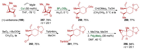 Para a síntese do intermediário avançado 256 (Esquema 56), o grupo de Liu199 utilizou a (+)-verbenona (199) como material de partida. Uma adição 1,4 diastereosseletiva (rd > 20:1) de cuprato de vinila (78%) gerado in situ deu origem ao centro quaternário em 257. A abertura de ciclobutano (75%), seguida pela formação de um acetal (77%) e oxidação alílica (75%), formou o aldeído 260. A conversão deste na hidrazona 261 (77%) viabilizou o preparo do intermediário avançado 256 através de uma reação de ciclopropanação intramolecular catalisada por paládio (94%).200