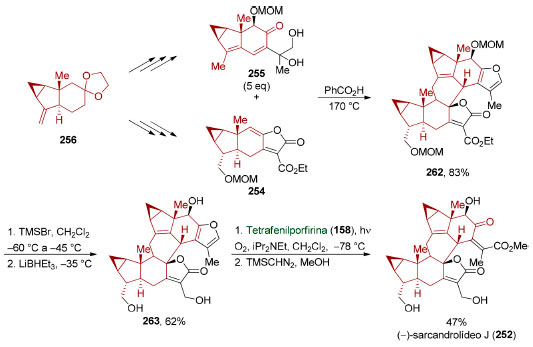 O intermediário 256 foi então utilizado na síntese dos fragmentos 254 e 255 (Esquema 57). A reação de cicloadição [4+2] necessária para a formação do anel central pôde ser realizada na presença de excesso de PhCO2H, em um tubo selado a 170 °C (83%). Devido à instabilidade do dieno 253, necessariamente formado in situ, excesso (5 equiv.) do seu precursor, o ceto-diol 255, teve que ser utilizado. Após remoção do grupo de proteção e redução do éster (62%), uma reação de oxidação fotocatalisada do furano, seguida por uma esterificação (47%), forneceu o (−)-sarcandrolídeo J (252).