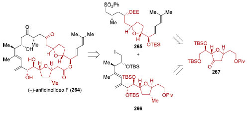 O reconhecimento de simetria escondida não está limitado à presença de dímeros (ou oligômeros) uma vez que não é necessário que tenha uma interdependência direta com a origem biossintética da molécula-alvo. Em 2013, Carter e colaboradores realizaram a síntese total do (−)-anfidinolídeo F(264),201 um macrolídeo de 25 membros contendo 11 estereocentros e duas unidades tetraidrofurânicas. A análise retrossintética identificou uma simetria escondida ao reconhecer que as unidades tetraidrofurânicas presentes em cada um dos fragmentos (265 e 266) de uma síntese convergente podem ser sintetizadas a partir do mesmo intermediário avançado 267 (Esquema 58).