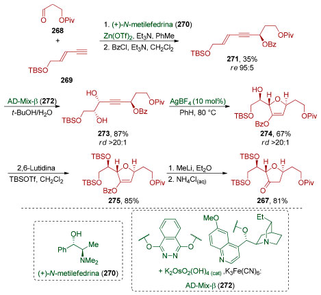 Em sua síntese do intermediário avançado 267 (Esquema 59), o grupo de Carter introduziu o primeiro estereocentro através de uma reação de alquinilação enantiosseletiva de 268, seguida de uma reação de benzoilação (35%, re 95:5).202 Uma reação de di-hidroxilação de Sharpless em 271 introduziu outros dois estereocentros (87%, rd > 20:1) e foi seguida pela formação do di-hidrofurano 274, através de uma ciclização catalisada por prata (67%, rd >20:1). Proteção da hidroxila livre de 274 (85%), seguida por uma hidrólise do benzoato de vinila 275 (81%), forneceu o intermediário avançado 267.