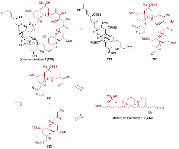 Em 2005, Ley e colaboradores realizaram uma das sínteses totais da (+)-espongistatina 1 (278),203 um macrolídeo de 42 membros, contendo 24 estereocentros, dois anéis tetraidropirânicos e dois acetais espirocíclicos. A análise retrossintética (Esquema 61) indica que o fragmento contendo os dois acetais espirocíclicos 280 pode ser preparado de forma convergente, a partir de dois intermediários avançados 281 e 282, cada um contendo um acetal espirocíclico. A simetria escondida foi identificada ao se reconhecer que cada espirociclo pode ser preparado a partir de diferentes epímeros do intermediário 283.