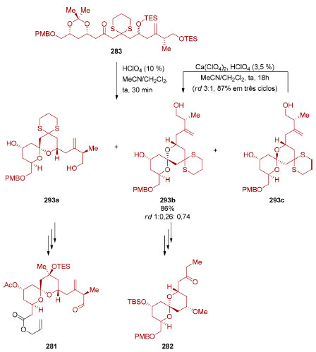 Em meio ácido, 283 foi convertido a uma mistura de três acetais espirocíclicos 293a-c. (86%, rd 4:1:3) que foram separados por CLAE preparativa (Esquema 63). Em meio ácido, o acetal indesejado 293c foi convertido no acetal desejado 293b (rd 3:1, 87% em três ciclos). Após várias etapas, 293a foi convertido no aldeído 281 e 293b na etilcetona 282.
