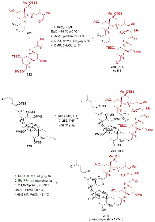 Os dois fragmentos espirocíclicos 281 e 282 (Esquema 64) foram combinados através de uma reação aldólica anti-seletiva mediada por enolato de boro (rd 5:1), seguida por acetilação e desproteção (51%). O fragmento 280 foi então conectado ao fragmento altamente funcionalizado206 279 através de uma reação de olefinação de Wittig Z-seletiva (50%). Para completar a síntese, foram necessárias as desproteções dos éteres p-metoxibenzila (65%) e do éster alílico, seguida por macrolactonização de Yamaguchi (56%). A (+)-espongistatina 1 (278) foi finalmente obtida após a remoção dos grupos de proteção de silício em 57% de rendimento.