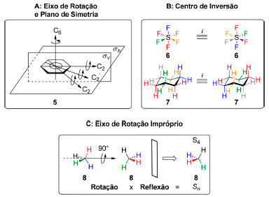 ![]() Figura 2. Operações e elementos de simetria em moléculas selecionadas: benzeno (5), hexafluoreto de enxofre (6), cicloexano (7) e metano (8). Nota: O uso de cores tem uma finalidade estritamente didática, uma vez que operações de simetria, quando aplicadas, não deixam alteração observável na disposição espacial do objeto