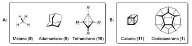 ![]() Figura 3. A: Compostos de simetria tetraédrica Td. B: Hidrocarbonetos inspirados em sólidos platônicos. Para o tetraedrano: 10a, R=H, 10b, R=CMe3 e 10c, R=SiMe3