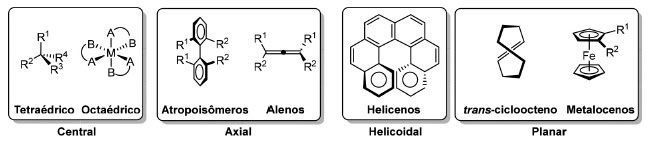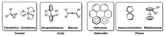 Um objeto quiral não possui um eixo de rotação impróprio, centro de inversão ou plano de simetria em nenhuma de suas conformações. Vários arranjos satisfazem esta definição, seja em moléculas orgânicas ou complexos de metais de transição (Figura 5).35 Utilizando-se uma definição visualmente simples, o termo quiralidade foi cunhado por W. Thomson (Lord Kelvin), ainda no século XIX: um objeto é quiral caso não coincida exatamente com sua imagem especular.36