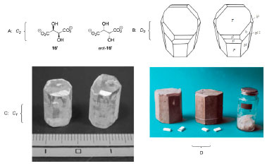 ![]() Figura 6. A: Diânions dos ácidos (-)- e (+)-tartárico (ent-16' e 16'); B: Hemiedros enantiomórficos esquematizados por Pasteur; C: Hemiedros imperfeitos cristalizados de tartarato de sódio e amônio;39 D: Modelo em cortiça confeccionado por Pasteur e cristais dos enantiômeros do tartarato de sódio e amônio38