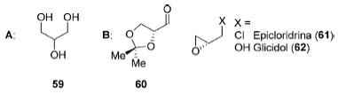![]() Figura 9. A: Glicerol (59). B: Derivados (60-62) do glicerol (59) mais utilizados em síntese orgânica