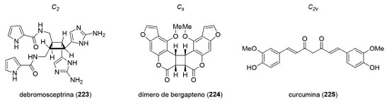 Planejamento sintético de moléculas simétricas Em um estudo de 2004, Greer e colaboradores, estimaram que o número de produtos naturais que possuem simetria bilateral, ou seja, compostos que pertencem aos grupos pontuais C2, Cs e C2v, corresponde a 7% dentro do espaço amostral de 3000 artigos analisados (Figura 12).179 Além disso, os autores estimam que cerca de outros 10% dos artigos investigados apresentam moléculas cuja biossíntese passa por intermediários com simetria bilateral que sofreriam modificações estruturais posteriores com perda de simetria.