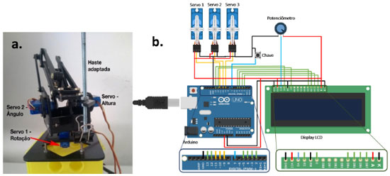 ![]() Figura 2. a. Foto do braço robótico montado com os respectivos servomotores e adaptação feita para fixar os substratos. b. Esquema das ligações elétricas e lógicas do braço robótico. No diagrama, as linhas vermelhas indicam o polo elétrico positivo, as pretas o negativo, as laranjas as conexões lógicas para acionamento dos servos e as verdes as conexões lógicas para o display LCD