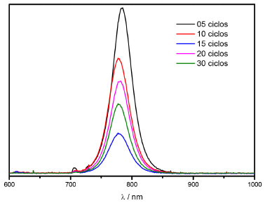 ![]() Figura 3.Intensidade de emissão de filmes de perovskitas depositados sobre camadas de TiO2 preparadas por diferente número de ciclos realizados pelo braço robótico proposto. Reproduzido da ref. 3 Copyright (2021), com permissão da Elsevier