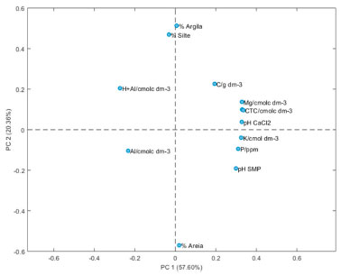 ![]() Figura 3. Gráfico de duas dimensões de loadings para caracterização de amostras de solo de Lapa, PR