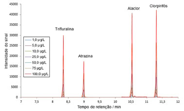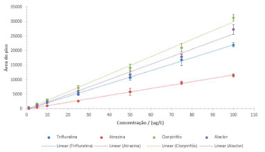 ![]() Figura 6. Curvas analíticas para os compostos alaclor, atrazina, clorpirifós e trifluralina, nas concentrações de 1,0 a 100,0 µg L-1. N=3