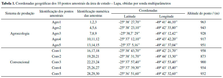 PARTE EXPERIMENTAL Amostragem O Assentamento Contestado fica localizado a 62,3 km do centro da cidade de Curitiba, Paraná, e é composto por 10 lotes, de 10 a 15 ha cada um, totalizando aproximadamente 3228 ha, considerando também a área de reserva natural. A partir da análise cartográfica e de pesquisas em campo, realizou-se a seleção de 5 pontos agroecológicos e 5 pontos convencionais, em que foram coletadas as amostras de solo. A Tabela 1 apresenta as coordenadas dos 10 pontos amostrais, que foram identificados de acordo com o tipo de produção de alimentos. Todos os pontos amostrais foram demarcados pelo GPS com o uso de sonda multiparâmetros HI9829, Hanna Instruments. A distribuição dos pontos amostrais é apresentada na Figura 1S no Material Suplementar.