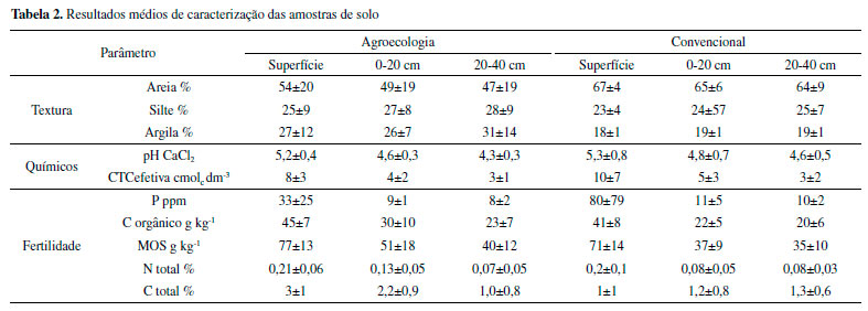 RESULTADOS E DISCUSSÃO Caracterização Na Tabela 2 são apresentados os resultados médios de caracterização das amostras de solo dos sistemas agroecológico e convencional.