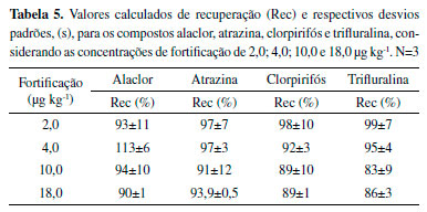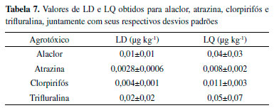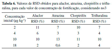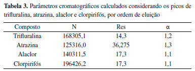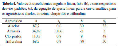Todos os valores de r2 foram iguais a 0,99, de modo que as equações de regressão linear são estatisticamente significativas. Verifica-se que alaclor e clorpirifós são os analitos que têm maiores coeficientes angulares, ou seja, maiores sensibilidades ao método. Ainda, esses são os mesmos compostos que apresentam maiores intensidades de sinal no cromatograma da Figura 4. Considerando a equação y = ax + b, obteve-se os valores que são apresentados na Tabela 4, onde (a) e (b) são os coeficientes angulares e lineares, respectivamente, juntamente com seus desvios padrões, (s).