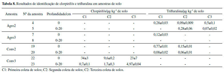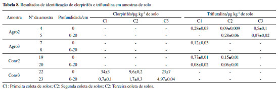 Assim, LD e LQ foram crescentes para atrazina, clorpirifós, alaclor e trifluralina. Masiá et al. (2015) obtiveram os valores para alaclor (10 μg kg-1), e atrazina (2,6 μg kg-1). Já Polese et al. (2002) obtiveram os valores de LQ de 60 e 20 μg kg-1 para trifluralina e atrazina, respectivamente, valores 1200 e 2500 vezes superiores aos encontrados neste estudo, respectivamente. Os valores obtidos por Yang et al. (2010) também foram superiores, 827 e 1481 vezes para atrazina e clorpirifós (6,7 e 16,3 μg kg-1) respectivamente, em relação à esta pesquisa. Chai e colaboradores (2014) obtiveram 2 e 5 μg kg-1 de LQ para clorpirifós para dois tipos de solo diferentes. Portanto, é possível observar que este trabalho apresentou LD e LQ inferiores aos encontrados na literatura. Identificação e quantificação de agrotóxicos nas amostras de solo Considerando os resultados de extração de agrotóxicos nas amostras de solo, alaclor e atrazina não foram detectados, enquanto que clorpirifós foi quantificado em Conv3 e a trifluralina em Agro2 e 3 e Conv2. O alaclor é um composto de uso proibido no estado do Paraná desde o ano de 2013, o que pode justificar a não detecção do mesmo. A atrazina é utilizada por alguns produtores convencionais no Assentamento Contestado. A não identificação de atrazina pode ser devido à rápida transformação deste composto em seus metabólitos que, por sua vez, não são facilmente identificados devido à ausência de seus padrões analíticos. O tempo de meia vida da atrazina é de 60 dias, mas os metabólitos que podem ser gerados, por efeito de degradação microbiana, podem persistir por longo tempo no solo, mas não sendo identificados pelo método apresentado neste estudo.10,15 Os resultados são apresentados na Tabela 8.
