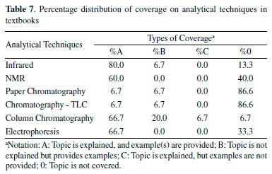 Types of intermolecular forces Table 4's data reveals that textbooks introduce five types of intermolecular forces (hydrogen bonds; London forces; dipole-dipole; ion-dipole, and dipole-induced dipole) in different ways. 86.7% of the books present hydrogen bonding and provide examples. However, 13.3% of them only offer examples of this type of interaction but do not explain it. 80.0% of the books present the London forces. While 80% of the books explain and provide examples of London forces, 6.7% of the books only introduce the dipole-dipole interactions by giving examples, and no explanation is given. 93.3% of the books present the ion-dipole interactions. However, only 40% of the books explain and provide examples of this type of interaction, while 53.3% show examples to introduce the interaction with no explanation. Only 13.4% of the books present the dipole-induced dipole interaction, while the ion-induced dipole interaction is not present in any book. Physical properties Physical properties are closely related to organic compounds' physical properties; however, organic chemistry textbooks present (or not) them in very different ways (Table 5). Melting point, boiling point, and solubility are the physical properties presented in most books: 93.3%, 93.3%, and 100.0%, respectively. These physical properties are explained with examples, figures, and graphs and are usually introduced in those chapters which present the functional groups. Density is a topic present in 60% of the books. However, only 40% of the books explain this property and provide examples. In 20% of the books, density is mentioned without defining its relationship with the intermolecular forces. Other physical properties, such as vapor pressure, surface tension, adhesion-cohesion, capillarity, and viscosity, are not mentioned in at least 80.0% of the books surveyed. Besides, in none of the cases, the books explain the relationship between these properties and the intermolecular forces neither provide any examples. Some textbooks introduce those physical properties (except adhesion-cohesion) through examples, but no explanation is given. Biomolecules Biomolecules are closely related to the intermolecular forces. IMFs are responsible for attractive forces between the biomolecules and other 3D structures like DNA, proteins, and drugs. Table 6 shows that at least 80.0% of the books present all seven biomolecules by relating them to IMFs in different ways. Besides, 86.7% of the books introduce interactions between drugs and receptors; however, 20.0% of this total only present examples of interactions between drugs and receptors but do not explain the intermolecular forces' action. The same takes place with four other biomolecules in 6.7% of the books. Analytical Techniques Infrared, nuclear magnetic resonance (NMR), chromatography, and electrophoresis are analytical techniques closely related to the intermolecular forces. For example, in infrared, the O-H stretching of alcohol results in broad bands (3200-3550 cm-1) when alcohol bonds intermolecularly to another by hydrogen bonding. The chemical shift of hydrogens bonded to oxygen atoms varies if hydrogen is interacting intermolecularly with the solvent. All chromatographic techniques (paper, column, TLC, electrophoresis, among others) promote the separation of organic compounds based on the different types of attraction forces between the organic compound (in the mobile phase) and the stationary phase. Table 7 shows that the influence of intermolecular forces on infrared spectra is mentioned in 86.7% of the textbooks surveyed. In 80.0% of them, the content is explained by providing examples. In comparison, in 6.7% of the books, the bandwidth phenomenon is presented by showing examples without any explanation related to the hydrogen bonding. The intermolecular forces are present in only 60% of the textbooks at the chapter that introduces the NMR. The forces of attractions are explained with the providing of examples. 86.6% of the books surveyed do not mention the paper chromatography and thin-layer chromatography (TLC) or any relation between them with the intermolecular forces. 86.7% of the books introduce column chromatography and explain its relationship with the intermolecular forces' influence on the process. However, 20.0% of the books just present the technique through examples without explaining the importance of intermolecular forces on separating compounds. Finally, only 66.7% of the books surveyed mention the electrophoresis as an analytical technique related to IMFs. Other topics related to intermolecular forces There are other topics related to intermolecular forces whose mastery is essential to the students (Table 8). For example, the intermolecular forces are crucial in the fiber dyeing process. The survey findings revealed that 53.3% of the textbooks do not cover that topic; 13.3% explain the occurrence of intermolecular forces between dyes and fibers and provide examples, and 33.3% of the books only provide examples but do not give any explanation on the influence of the IMFs on the dyeing process. The shape of meniscus and drops from different liquids depends on the balance between the cohesive and adhesive forces, strictly related to the IMFs. However, 93.3% of the textbooks also do not cover that topic. Only 6.7% of the books surveyed explain the format of meniscus and drops based on IMFs by providing examples. The salting-out effect is an electrolyte-non-electrolyte interaction whose mastery would help students understand what happens when we add an aqueous saline solution to break the emulsion formed in the liquid-liquid extraction process. Unfortunately, none of the 15 textbooks surveyed covers that content. Finally, polymers have properties that depend significantly on the forces that act between the chains. 86.7% of the books cover that topic. 60.0% of them explain it by providing examples, while 26.7% only give the examples, failing in the absence o