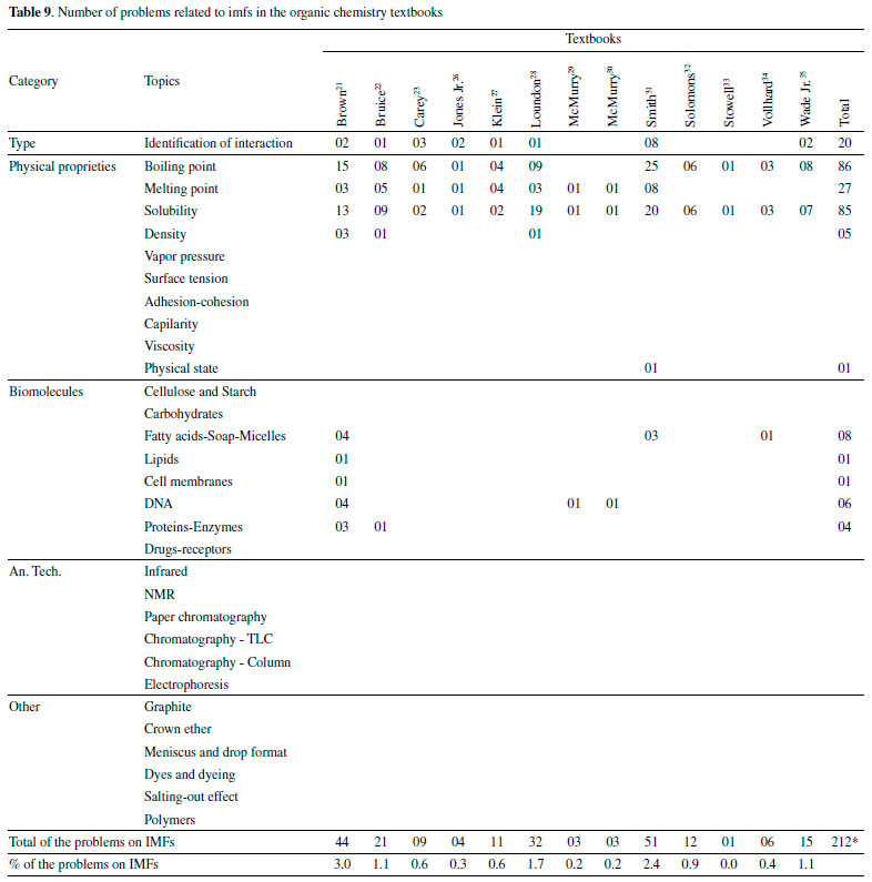CONCLUSIONS This paper analyzes fifteen organic textbooks most commonly used at Brazilian universities to find out how the books address the intermolecular forces and related topics. We found that all books cover the theme, but none has a specific chapter on IMFs. Regarding the problems associated with IMFs, the subject is usually spread over several chapters, varying from one up to twelve chapters. Thirteen of the fifteen books have at least one problem regarding intermolecular forces. However, the vast majority of problems (83.6%) are related to the organic compounds' physical properties. 8.2% are associated with identifying intermolecular forces between chemical species, and 8.2% are regarding the biomolecules. The absence of problems about the relationship between the intermolecular forces and analytical techniques, organic molecules' structures like graphite and polymers, and important chemical phenomena such as the salting-out effect may negatively impact the students' learning. As textbooks are a powerful and widely used medium for information transmission, we believe that intermolecular forces' coverage is inadequate and needs to have more significant editors' attention in the next editions of the organic chemistry textbooks.
