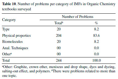COVERAGE OF TOPICS RELATED TO INTERMOLECULAR FORCES We have also surveyed the organic chemistry textbooks currently used in Brazilian universities to reveal which topics related to the intermolecular forces are included in them. We analyzed 34 issues distributed in five categories: i) types; ii) physical properties; iii) biomolecules; iv) analytical techniques; and (v) other. Tables 3-8 summarize the results of the search.