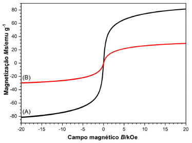 ![]() Figura 4. Curvas de magnetização das amostras (A) Magnetita e (B) Pani-Mag