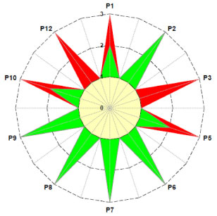 Esse resultado é satisfatório para caracterizar o compósito Pani-Mag como magnético, que confere ao compósito melhora na estabilidade térmica, nas propriedades ópticas, eletroquímicas, magnéticas e mecânicas. Essas características o tornam promissor para aplicação em sensores e dispositivos eletroquímicos.27,29 Em geral, nos polímeros condutores não espera-se elevados valores de magnetização de saturação, pois a propriedade magnética depende da regularidade e da ordem estrutural das cadeias. Cadeias com maior linearidade e mais estendidas, permitem maior estabilidade de bipôlaron, o que leva a uma redução da contrubuição magnética. Por outro lado, quando as cadeias estao mais curtas, permitem mais pôlarons localizados, o que aumenta a magnetização.29 A magnetita tem facilidade de se aglomerar, o que resulta em magnetismo mais fraco e dispersabilidade. O tamanho de partícula e a quantidade de magnetita que será incorporada no polímero são cruciais para obter materiais com boas propriedades magnéticas.29 Aspectos de sustentabilidade - Química Verde Na Figura 5, observa-se o gráfico de EV representando as cores verde, que comtemplam os critérios da métrica sustentável, e vermelho para o não cumprimento desses princípios. Quanto mais verde é o gráfico, maior é o índice de verdura e mais satisfatórios para princípios de sustentabilidade. O IPE obtido foi de 65% em escala que varia de 0 a 100, o que é considerado aceitável com bons indícios de uma síntese sustentável, apesar de ter sido utilizado reagentes que representam risco potencial para a saúde e ambiente como a anilina e o DBSA.