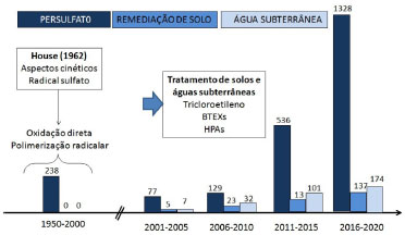 ![]() Figura 1. Evolução das publicações relacionadas ao uso de persulfato (Fonte: Periódicos CAPES)
