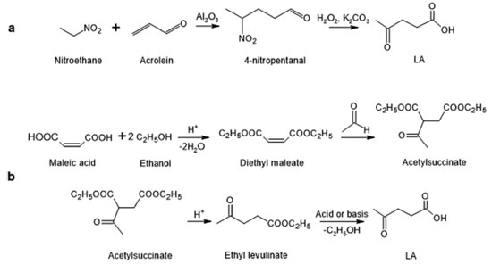 One LA synthesis petrochemical route is the conjugate addition of nitroethane to acrolein in the presence of Al2O3 to form 4-nitropentanal.19,20 4-Nitropentanal is then oxidated in the presence of H2O2-K2CO3 to form LA (Figure 2a). Through another LA route from oil, maleic acid is used as feedstock (Figure 2b), which is then converted in acidic media into its respective ester, and, with the breakage of the double bond between carbons, acetyl succinate is obtained, followed by ethyl levulinate, and, after hydrolysis in the presence of acid or base, LA is formed.21