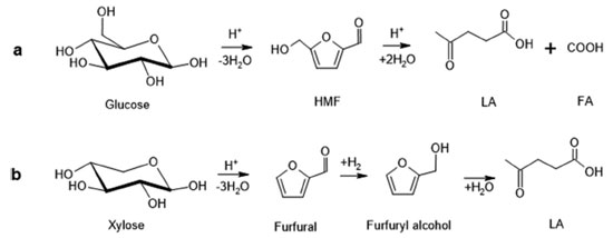 ![]() Figure 3. Main paths for levulinic acid formation from biomass, having as precursors: a) glucose, b) xylose21