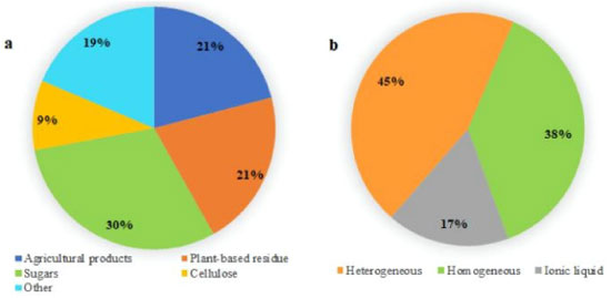 ![]() Figure 5. Distribution of publications relative to levulinic acid synthesis segregated in terms of type of used: a) substrate, b) catalysis