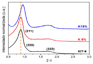 ![]() Figura 1. Difratogramas de raios X do suporte KIT-6 e dos materiais híbridos