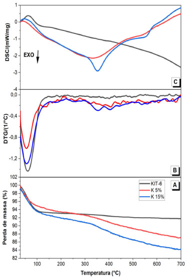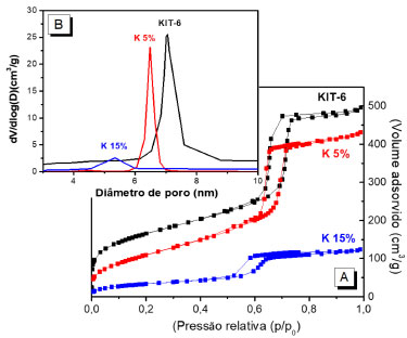 Ao analisar as curvas TGA e DTGA, observa-se que o suporte apresentou apenas um evento de perda de massa quantificado em 7,0%, referente a saída de água fisissorvida em uma faixa de temperatura de 25° C à 110 °C. Os materiais adsorventes apresentaram dois eventos de perda de massa, no qual o primeiro evento, na faixa de 25 °C à 110 °C, é referente à saída da água fisissorvida e o segundo evento, acima de 110 °C, é referente à degradação térmica e oxidativa da amina utilizada. Esses eventos térmicos se assemelham a trabalhos encontrados na literatura.18-20 As curvas de DSC corroboram com as análises de TGA e DTGA, demonstrando que o primeiro evento é endotérmico, referente a vaporização da água fisicamente adsorvida que absorve energia (para todos os materiais) e o segundo evento exotérmico, referente a degradação térmica e oxidativa da amina incorporada que libera energia. Através dos dados obtidos na TGA também é possível determinar a porcentagem real de amina inserida, como relatado por Santos et al.,21 em um estudo sobre impregnação de quitosana no SBA-15. Os resultados obtidos na análise termogravimétrica indicam impregnações reais, significativas, sendo observadas quantidades de 7,9% e 9,1%, para os materiais K5%, e K15%, respectivamente. Outra informação obtida foram os valores dos grupos aminos presentes nos materiais impregnados, com base nas porcentagens de amina obtidas pode-se determinar os valores de 0,81 mmol N/g e 1,32 mmol N/g, para as amostras K5% e K15%, respectivamente. Esses resultados confirmam a presença dos grupos aminas no suporte inorgânico. Adsorção e dessorção de N2 A Figura 3 apresenta as isotermas de adsorção/dessorção de N2 e as distribuições de diâmetro de poros de todos os materiais desenvolvidos. A Tabela 1 apresenta os valores determinados das propriedades texturais de todos os materiais obtidos.