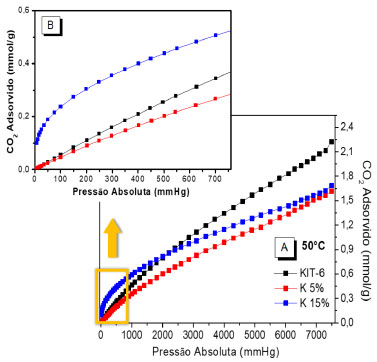 ![]() Figura 7. a) Isotermas de adsorção de CO2 do suporte KIT-6 e dos materiais híbridos a 50°C; b) em destaque a adsorção em baixas pressões