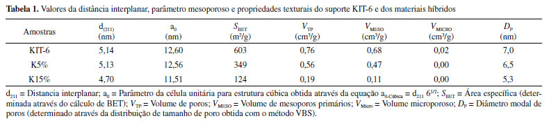 Os difratogramas de raios-X apresentaram reflexões características de materiais do tipo KIT-6, com índices de Miller (211), (220) e (332).12,15,16 Esse resultado demonstra que mesmo após a funcionalização a estrutura do suporte foi mantida. Entretanto, nota-se que ao aumentar a quantidade de APTMS inserida ocorre um pequeno deslocamento no pico principal (211) na amostra K15%, indicando uma interferência na mesoestrutura dos materiais e uma possível perturbação na estrutura do material em questão. Uma provável explicação para tal comportamento é o preenchimento da superfície e dos poros com compostos orgânicos, o que dificulta a difração através da estrutura mesoscópica.17 A Tabela 1 apresenta os valores das distâncias interplanares e do parâmetro mesoporoso do suporte KIT-6 e dos materiais híbridos. Pode-se observar uma diminuição no parâmetro mesoporoso quando se aumenta a quantidade de APTMS, sendo que a amostra K15% apresentou o menor valor, indicando que a mesoestrutura sofreu alteração devido, provavelmente, a maior quantidade de amina inserida, corroborando com as discussões do DRX. Os resultados indicam que quanto maior a quantidade de amina, menor é o valor da distância interplanar e do parâmetro poroso dos materiais. Esse comportamento é um indicativo da presença da amina, tanto dentro dos poros, quanto na área externa dos materiais.