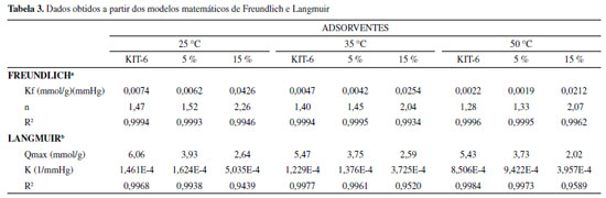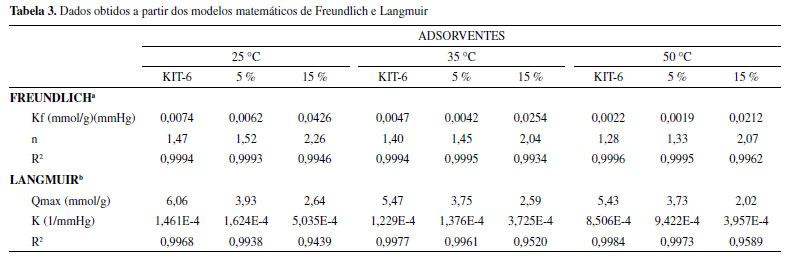 Os resultados de adsorção de CO2 obtidos a 25°C (melhor condição de adsorção) apresentaram as melhores capacidades de adsorção a 760 mmHg, na qual a amostra K15% apresentou a maior capacidade de adsorção (0,80 mmol/g) e uma melhor eficiência (0,60) em comparação a amostra K5%. Essa eficiência leva em consideração a estequiometria de 2 mol de N para 1 mol de CO2.7 A altas pressões ocorreu comportamento inverso, sendo o material KIT-6 a que apresentou valores mais significativos (3,3 mmol/g). Esse comportamento pode ser explicado pelo fato de pressões mais baixas favorecerem a adsorção química (quimissorção) realizada através dos materiais funcionalizados, enquanto pressões mais altas favorecem a adsorção física (fisissorção), tipo de adsorção que é mais acentuada no material puro, conforme descrito no estudo de Sanz et al.27 Resultados semelhantes foram obtidos por Aziz e colaboradores em 2012,28 em que eles determinaram que em baixas pressões o CO2 tende a quimissorver. Isso ocorre, pois, como descrito pelos autores, o CO2 quimissorvido apresenta valores de entalpia de adsorção próximos a 98 kJ mol-1 apresentando maiores valores. Enquanto o CO2 fisissorvido apresenta valores de entalpia de adsorção próximos a 35 kJ mol-1 em materiais de sílica mesoporosa. Como visto nas propriedades texturais (Tabela 1), o suporte KIT-6 apresentou maior área específica entre os adsorventes utilizados (603 m2/g), o que propicia maior área para captura das moléculas de CO2, pincipalmente, a altas pressões. Para os materiais híbridos a área foi, consideravelmente, reduzida, mas devido à presença das aminas, as interações químicas entre o CO2 e os grupos amino (quimissorção) são mais evidenciadas, principalmente a baixas pressões, e sofrem um aumento, embora não tão significativo quanto no suporte KIT-6 a altas pressões. Os resultados de adsorção de CO2 se mostraram bastante satisfatórios, pois se conseguiu uma boa capacidade de adsorção a baixa temperatura e pressão com um adsorvente com baixa concentração de amina impregnada. Outro resultado importante foi a capacidade de adsorção do material puro, mesmo a baixas pressões o material conseguiu adsorver quantidades semelhantes e até superiores a materiais do mesmo tipo relatados na literatura.2,11 Dessa forma, existem diferentes possibilidades, dependendo das condições de temperatura e pressão, que se deseja realizar a adsorção do CO2. Aplicação dos modelos de Freundlich e Langmuir A Tabela 3 apresenta os valores obtidos a partir dos modelos matemáticos de Freundlich e Langmuir, aplicados nas isotermas de adsorção de CO2, e a Figura 8 apresenta, de forma representativa, as isotermas da amostra K15% à 25 °C após os tratamentos matemáticos.