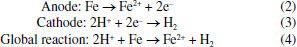 Several studies mention that there exist different methods for hydrogen production such as dark fermentation, coal gasification, electrolysis, amongst other. At present more than 90% of hydrogen in the market is provided by steam reforming of methane.12,13,14 Electrolysis, for example, is the process in which electrical energy is used to force the non-spontaneous cleavage of H2O and a large number of variations can be found in the literature.15 Furthermore, electrochemical hydrogen production via electrolysis provides good energy efficiency as well as with the lowest cost rate. An electrolytic cell is an experimental assembly in which electrolysis is performed, which consists of a pair of electrodes made of a non-reactive metal, such as platinum, immersed in an electrolyte solution. These electrodes must be connected to a power source. In addition, the reaction will easily occur in a 0.1 mol L-1 solution of H2SO4, as in this case there are enough ions to conduct electricity.16 One of the challenges of electrolysis produced from solar technologies is that the transfer of energy from the photovoltaic generator to the electrolyzer is dependent on the instantaneous climatic conditions and how they are connected.17 Another method used is anaerobic fermentation, where simple, pure sugars, naturally contained in biomass, are converted into H2, CO2 and organic acids in the presence of microorganisms. Among the biological processes for H2 generation, anaerobic fermentation is considered more viable, as it does not need an external energy source and various types of industrial waste and effluents can be carbon sources for microorganisms. Large amounts of hydrogen have been produced by this technique. However, the main constraint of this production method is its low performance when compared to other existing chemical and electrochemical methods.18 Steam reforming of hydrocarbons is the most widely used process for large-scale H2 production. In this process, a mixture of water vapor and hydrocarbons reacts at high temperatures in the presence of a catalyst, forming a mixture of CO2 and H2. The most used hydrocarbon in the reform process is natural gas (CH4).19 The main form of H2 generation is by steam reforming furnaces, which are made up of a series of vertical tubes inside an externally heated radiation chamber that focus on the tube walls. Inside these tubes run hydrocarbons or alcohols and water vapor that at high temperatures react endothermically. The problem with this hydrogen production process is that it generates gases that contribute to the greenhouse effect.20 Partial oxidation methane of can be complex depending on the catalyst used and the operating conditions. There are two partial oxidation mechanisms: indirect, in which part of the methane is first oxidized to CO2 and H2O, producing synthesis gas.21 This process has the advantage of being able to dispense the need for catalysts. However, the operating temperature range is 1200-1500 °C range and requires high pressures.22 Cyanobacteria use biophotolysis to produce H2 by employing solar energy and water, producing H2 and O2 without emitting CO2, using N2, atmospheric CO2, and H2O as electron sources and sunlight as energy.23,24 H2 generation by microorganisms has been recognized as being a renewable source, presenting low production costs and not being dependent on agricultural areas, as in the case of biofuels. The production method using photosynthetic microorganisms is a valid alternative, but it is a great challenge, as it presents low efficiencies in the conversion of solar energy, requiring optimization.25 An alternative method for the generation of H2, is acid electrochemical corrosion, which can be performed by reusing waste metals from metal workshops or waste building metals. The process takes advantage of the well-known corrosion process of metals to produce H2. Metals display a bright luster when cut/scratched, conduct heat and electricity, furthermore they are malleable and flexible. Metals tend to have low ionization energy, which results in easy cation formation, explaining why they undergo rapid oxidation.26 Corrosion itself can be defined as the process of material deterioration, most often associated with metals and chemical/electrochemical processes can occur in conjunction with mechanical effects.27,28 The electrochemical corrosion method can be used for H2 generation by means of a reaction between acid and metals, which consists in reducing the H+ ion generating H2.29 The method employs two half-reactions involving acid (H+) and a metal, and consists in reducing H+ to generate H2, as shown in Equation 1. ![]() Generally, this process is spontaneous, involving electron transfer during the oxirreduction process. The reactions involved are shown in Equations 2, 3 and 4.11 ![]() One drawback to this process is the need for concentrated acids, such as HCl, which can increase considerably the cost of the process. One alternative is the use of waste acids that are in need of disposal and one such possibility is Hexafluorsilic acid. Hexafluorsilic acid (H2SiF6), a waste product from the fertilizer industry, is used in water fluoridation, metal surface cleaning/treatment and pH control of textiles and laundries. In addition, FSA is used in the manufacture of aluminum fluoride of low bulk density, cryolite, silicon tetrafluoride and other fluorosilicates.30 However, there is a large production of this acid requiring new applications. This fact makes the use of this acid in the production of H2 by the acid electrochemical corrosion method an interesting research area. This study aims to investigate the feasibility of the production of H2 by acid electrochemical corrosion using waste materials (industrial by-products and waste iron). Most importantly, it was intended to employ HCl mixed in different proportions with a by-product of the phosphate fertilizer industry, namely H2SiF6. Additionally, waste metals (iron source) w