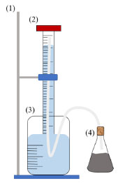 ![]() Figure 2. Hydrogen production system consisting of (1) universal holder, (2) measuring column filled with water for H2 collection, (3) water bath and (4) sealed batch reactor containing (H2SiF6 + HCl + Fe)