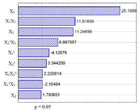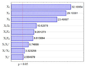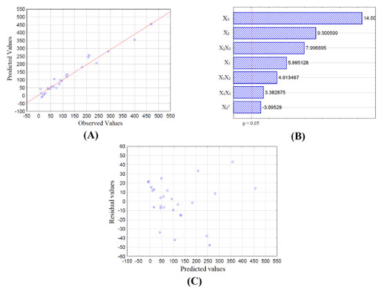 From the Pareto graph (Figure 7) it was observed that the linear term of time (X3) is significant compared to the other terms evaluated, having with a positive influence on the response. From the residuals graph (Figure 2S B) it was observed that the points are situated randomly around zero, which proves that the model is appropriate for the data, as no trend is observed.